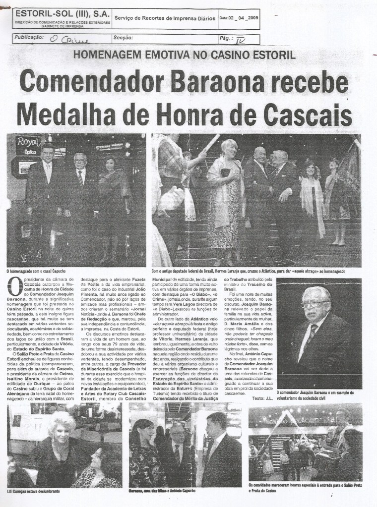 Joaquim Baraona (Ourique 1930 - Cascais 2018) Empresário Cascalense e Capixaba de coração. Homem dos sete ofícios foi Director da Misericórdia de Cascais, Vice-cônsul de Portugal em Vitória no Espírito Santo. Foi também jornalista e impulsionador das mais diversas associações como os Amigos do Paredão (Cascais). Foi Membro da Academia de Artes e Letras Espírito Santense e da Academia de Artes e Letras do Estoril. O Município de Domingos Martins inaugurou em sua honra uma praça no Parque das Hortências, projecto do qual foi fundador. Em 2009, foi agraciado com a Medalha de Honra de Cascais tendo posteriormente a Câmara Municipal de Cascais batizado uma rotunda com o seu nome. Ver todos os artigos de joaquimbaraona