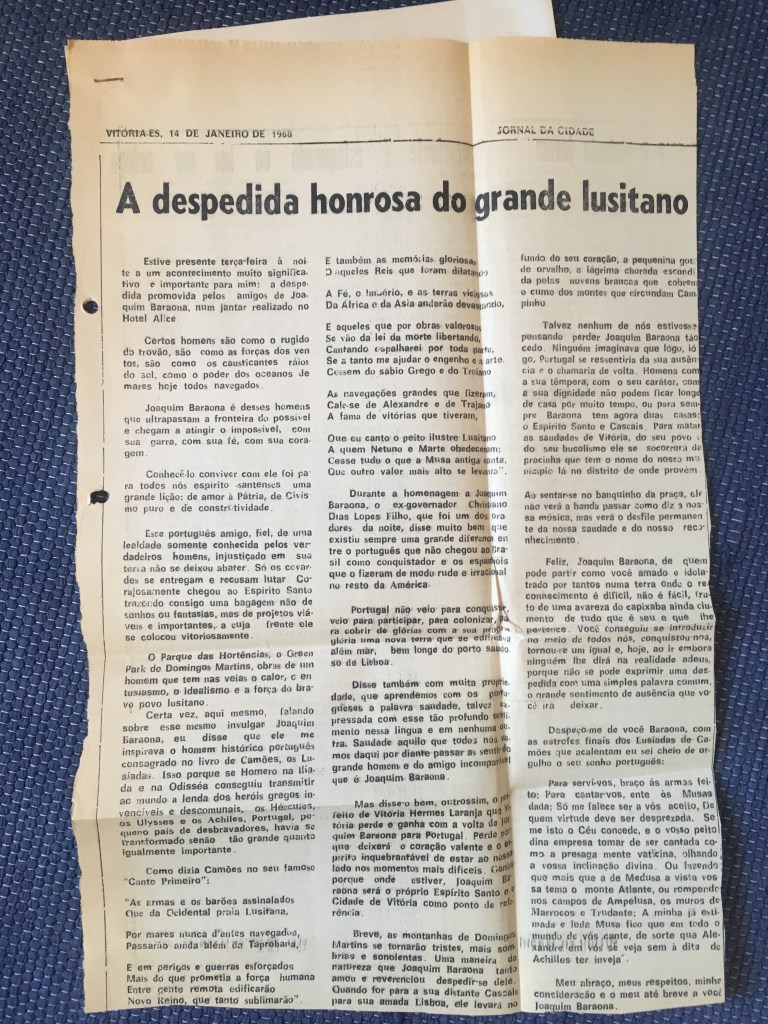 Joaquim Baraona (Ourique 1930 - Cascais 2018) Empresário Cascalense e Capixaba de coração. Homem dos sete ofícios foi Director da Misericórdia de Cascais, Vice-cônsul de Portugal em Vitória no Espírito Santo. Foi também jornalista e impulsionador das mais diversas associações como os Amigos do Paredão (Cascais). Foi Membro da Academia de Artes e Letras Espírito Santense e da Academia de Artes e Letras do Estoril. O Município de Domingos Martins inaugurou em sua honra uma praça no Parque das Hortências, projecto do qual foi fundador. Em 2009, foi agraciado com a Medalha de Honra de Cascais tendo posteriormente a Câmara Municipal de Cascais batizado uma rotunda com o seu nome. Ver todos os artigos de joaquimbaraona