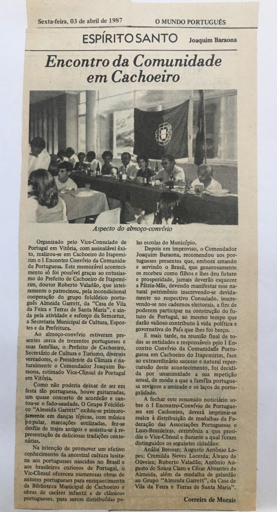 Joaquim Baraona (Ourique 1930 - Cascais 2018) Empresário Cascalense e Capixaba de coração. Homem dos sete ofícios foi Director da Misericórdia de Cascais, Vice-cônsul de Portugal em Vitória no Espírito Santo. Foi também jornalista e impulsionador das mais diversas associações como os Amigos do Paredão (Cascais). Foi Membro da Academia de Artes e Letras Espírito Santense e da Academia de Artes e Letras do Estoril. O Município de Domingos Martins inaugurou em sua honra uma praça no Parque das Hortências, projecto do qual foi fundador. Em 2009, foi agraciado com a Medalha de Honra de Cascais tendo posteriormente a Câmara Municipal de Cascais batizado uma rotunda com o seu nome. Ver todos os artigos de joaquimbaraona