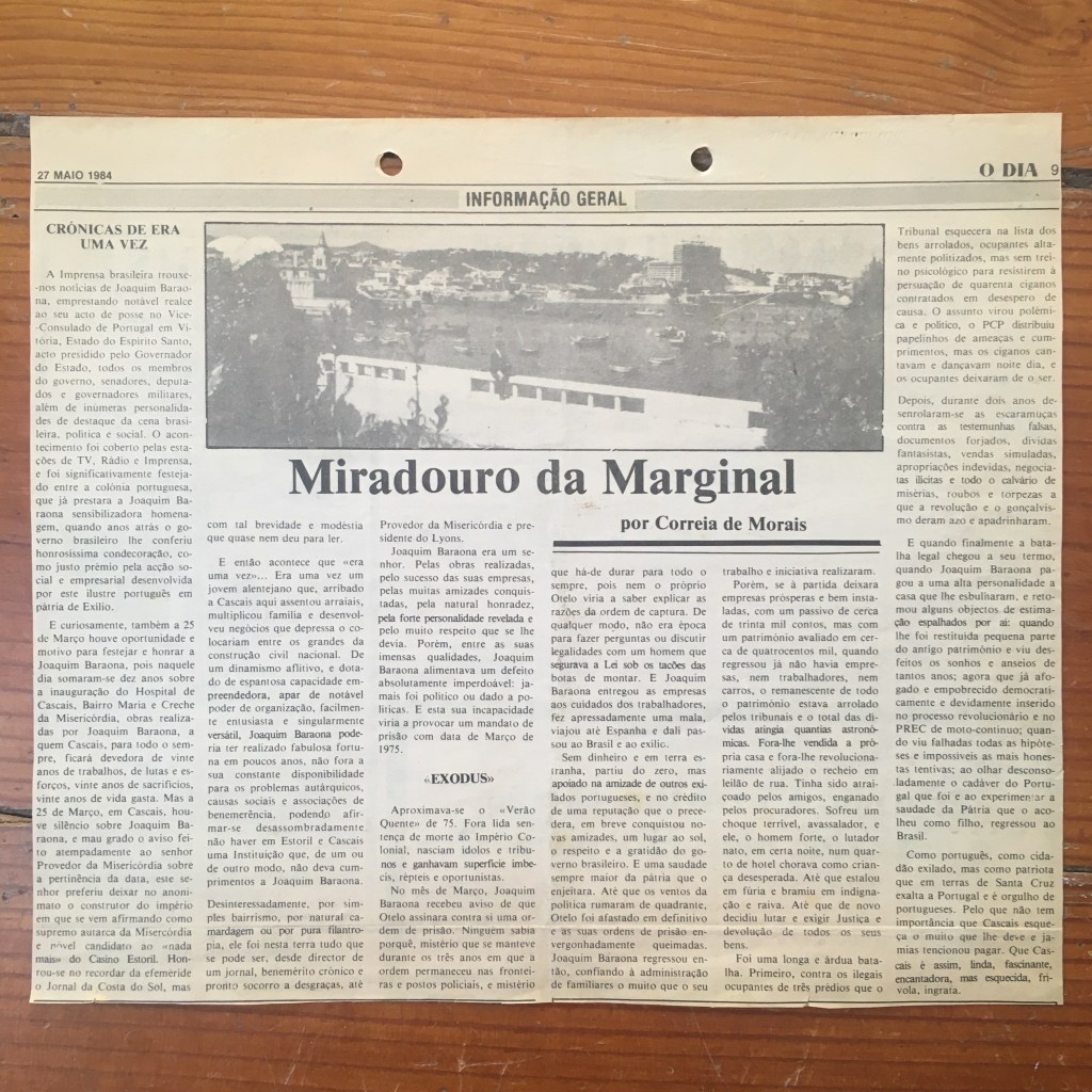 Joaquim Baraona (Ourique 1930 - Cascais 2018) Empresário Cascalense e Capixaba de coração. Homem dos sete ofícios foi Director da Misericórdia de Cascais, Vice-cônsul de Portugal em Vitória no Espírito Santo. Foi também jornalista e impulsionador das mais diversas associações como os Amigos do Paredão (Cascais). Foi Membro da Academia de Artes e Letras Espírito Santense e da Academia de Artes e Letras do Estoril. O Município de Domingos Martins inaugurou em sua honra uma praça no Parque das Hortências, projecto do qual foi fundador. Em 2009, foi agraciado com a Medalha de Honra de Cascais tendo posteriormente a Câmara Municipal de Cascais batizado uma rotunda com o seu nome. Ver todos os artigos de joaquimbaraona